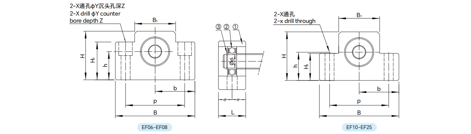 | EF25 | 25 | 30 | 105 | 68 | 52.5 | 35 | 66 | 25 | 85 | 11 | - | - | 6205ZZ | S25 | 0.95 |