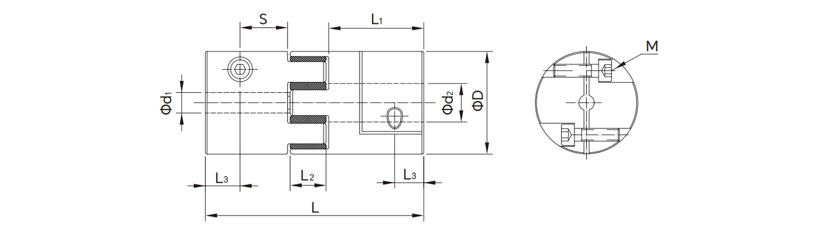 | Modelo No. | d1/d2 tamaño de poro | D (mm) | L (mm) | L1 (mm) | L2 (mm) | L3 (mm) | S (mm) | Tamaño del tornillo M | Par de apriete (N·m) | Par nominal (N·m) | Par máximo (N·m) | Velocidad máxima (RPM) | Momento de inercia (kg·m²) | Rigidez torsional estática (N·m/rad) | Excentricidad permitida (mm) | Desviación permitida (°) | Runout axial (mm) |