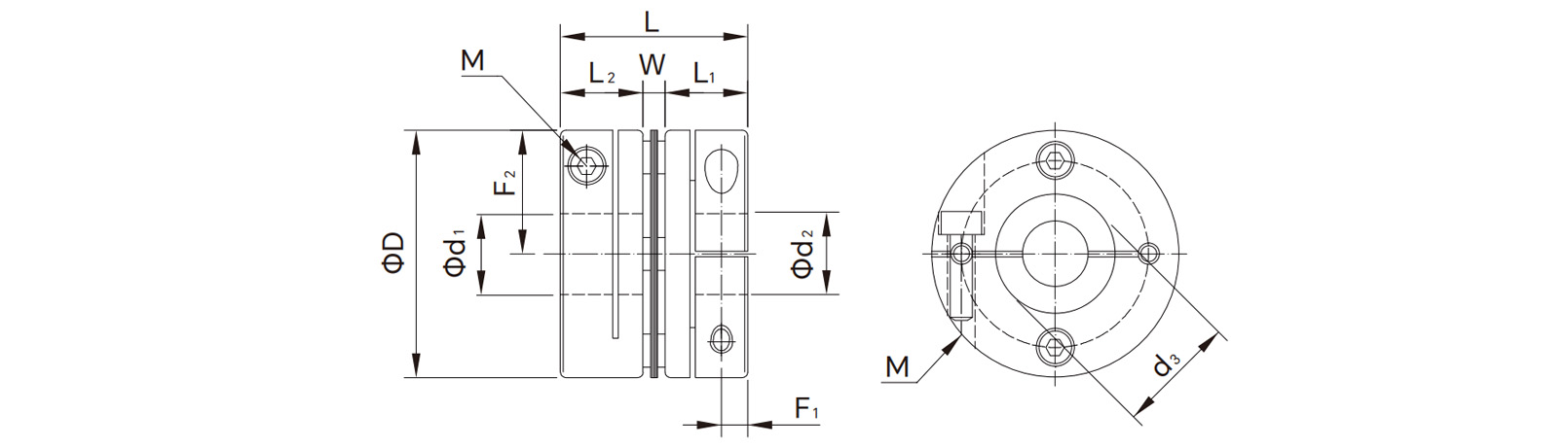 | Modelo No. | tamaño de poro d1/d2 | D (mm) | L (mm) | L1 (mm) | L2 (mm) | W (mm) | F1 (mm) | d3 (mm) | Tamaño del tornillo M | Par de apriete (Nm) | Par nominal (Nm) | Par máximo (Nm) | Velocidad máxima (RPM) | Momento de inercia (kg·m²) | Rigidez torsional estática (Nm/rad) | Excentricidad permitida (mm) | Desviación permitida (° ) | Runout axial (mm) |